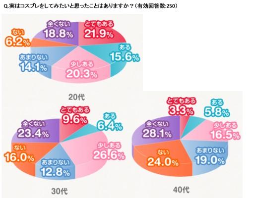 コスプレをしてみたいと思ったことが「とてもある」と最も多く回答したのは20代でした。また、「ある」「少しある」まで含めると、約6割に変身願望ありという傾向がみられ、30代以降と比べてもかなり高い比率であることが分かりました。