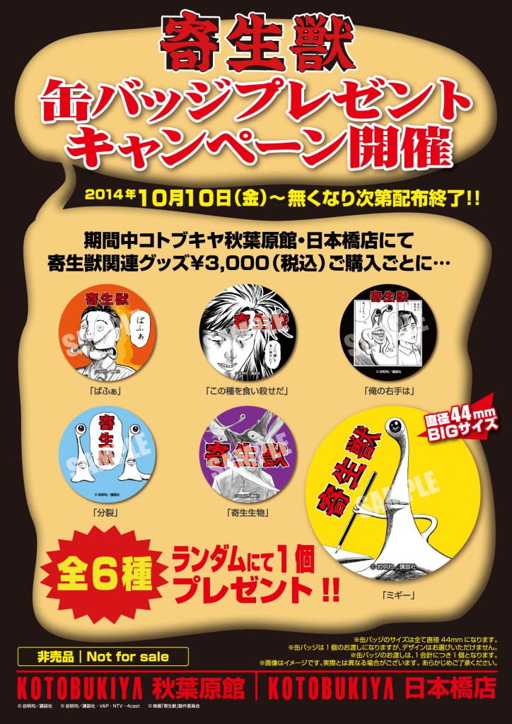 ●期間中コトブキヤ秋葉原館・日本橋店にて寄生獣関連グッズを¥3,000(税込)以上ご購入ごとに『非売品 寄生獣缶バッジ』を全6種から1個、ランダムにてプレゼントいたします。