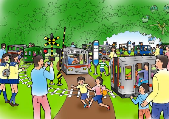 東急電車のカラーリングを模したライドを足でこいで運転できます。