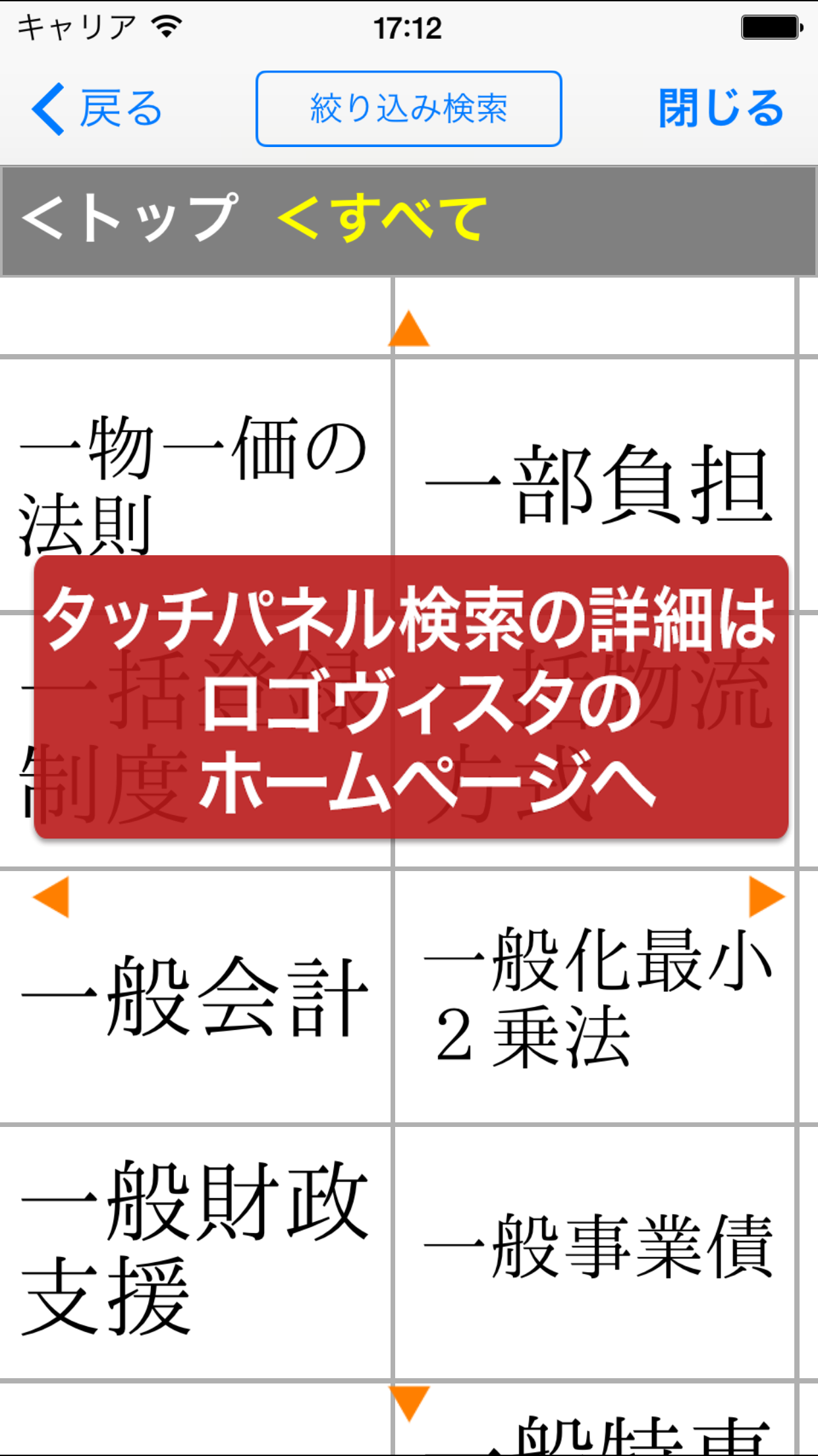 検索キーワードが見出し語(用語)のどの部分と一致したのか、分かりやすいように検索キーワードを中央に揃え、また色も変えて表示します。これによって難解な専門用語も直感的に探し出せます。