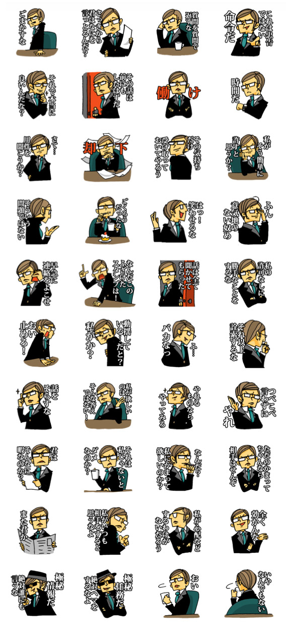「上から部長」の最大の特徴はインテリな風貌で歯に衣着せない物言い。普段は言えないことも部長にお任せすれば爽快に伝えられること間違いなし!普段から仲の良い友人や仲間に、スパイス感覚で使ってみるのはいかがでしょうか?ちょっとしたアクセントになるかもしれませんよ。