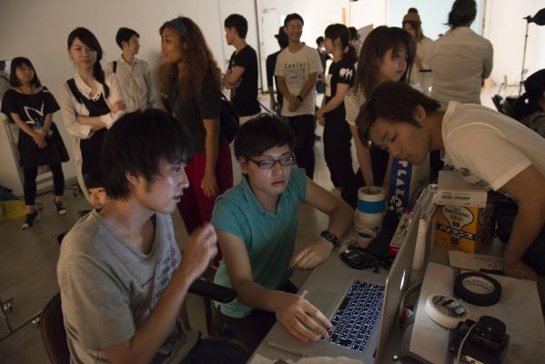 -学生たちによる広告ビジュアルの撮影の様子-(上・画像)