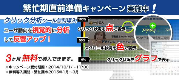 不動産業界の繁忙期となる年頭3ヶ月間(2015年1月~3月)、ホームページ内のユーザ動向が視覚的に把握できるクリック分析ツールを無料で提供します。繁忙期中にユーザ動向を計測しながらホームページ改善ができるので、人気コンテンツが明確になり、より反響をとりやすいホームページ改善をスピーディに行うことができます。