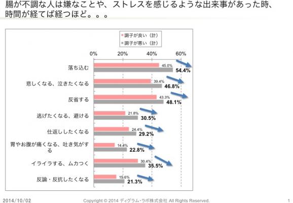 「あなたは、ふだんの生活の中で、嫌なことや、ストレスを感じるような出来事があったとき、時間が経てば経つほど、どのような気持ちになりますか、また何か身体の症状を感じますか」という質問に対して、腸の調子が悪い人は、腸が快調な人に比べて、「落ち込む」=54.4%、「悲しくなる、泣きたくなる」=46.8%、「反省する」=48.1%、「逃げたくなる、避ける」=30.5%、「仕返ししたくなる」=29.2%、「胃やお腹が痛くなる、吐き気がする」=22.8%、「イライラする、ムカつく」=35.5%、「反論・反抗したくなる」=21.3%と回答した人の割合が高い結果となった。とくに、「落ち込む」、「逃げたくなる、避ける」、「胃やお腹が痛くなる、吐き気がする」の3項目では8%を超える大きな差が出ている。