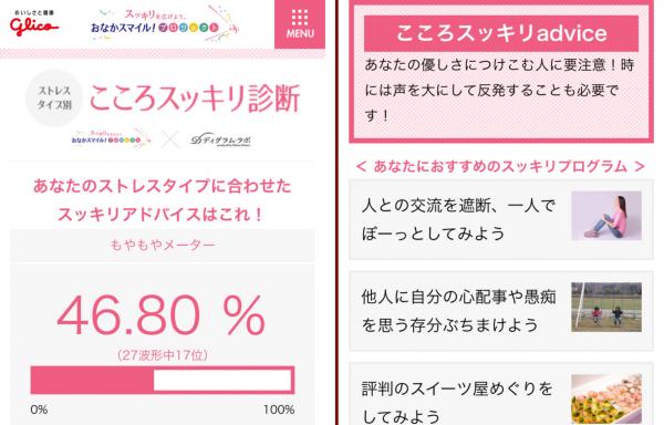 ディグラム・ラボ株式会社(本社:東京都港区、代表取締役:木原誠太郎)は、サイト「おなかスマイル!プロジェクト」(運営=グリコ乳業株式会社)上で2014年10月3日にリリースした「ストレスタイプ別 こころスッキリ診断」に、ディグラム診断アルゴリズムを提供いたしました。また、この診断コンテンツのリリースを記念いたしまして、ディグラム・ラボでは、日本全国の女性5000人に「ストレス」と「おなかの調子」の関連性について調査を実施いたしました。
