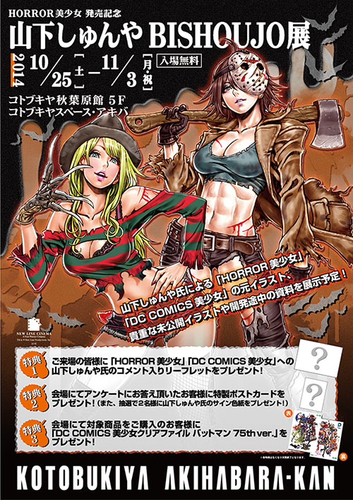「HORROR美少女」第一弾のフレディ・クルーガー、第二弾のジェイソン・ボーヒーズが9月から2ヶ月連続でリリースとなり、話題を呼んだ「BISHOUJOシリーズ」。このシリーズのイラスト原案を歴任する山下しゅんや氏による、「HORROR美少女」「DC COMICS美少女」等の貴重な未公開イラストや開発途中の資料を展示します。イベントへご来場の方には山下しゅんや氏による自作「HORROR美少女」「DC COMICS美少女」用イラストについてのコメント入りリーフレットをプレゼント。また、期間中対象商品を購入のお客様には、「DC COMICS美少女 クリアファイル バットマン75th ver.」をプレゼントします。さらに、会場にてアンケートにお答え頂いたお客様には、HORROR美少女特製ポストカードをお渡しします。(※いずれもなくなり次第終了となります。)山下しゅんや氏による「BISHOUJOシリーズ」の軌跡を貴重なイラストや資料とともにご堪能いただける、注目のイベントとなっています。