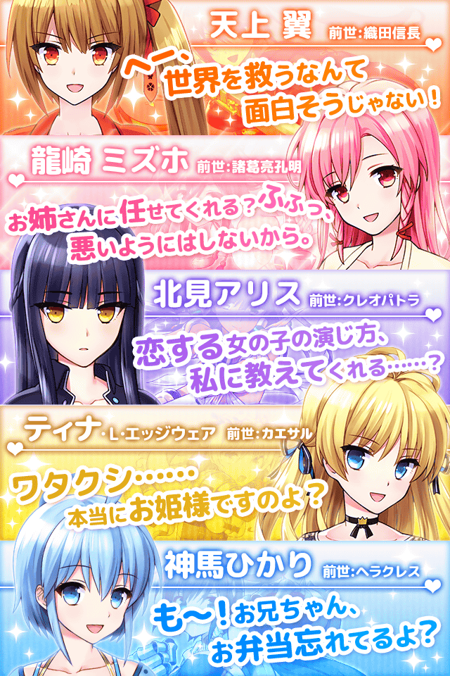 本作は、『ラブ×バトル』をコンセプトに、英雄の生まれ変わりである主人公のアナタと5人の美少女幼馴染みが世界を守るために、共に戦います。日常を共にする中で、アナタと幼馴染みの1人の絆は深まり、除々に相手に惹かれていく模様を描いた恋愛シミュレーションゲームです。