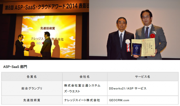この度『第8回 ASP・SaaS・クラウドアワード 2014』を受賞した『GEOCRM.com』は、独自の特許技術と新たなビジネスモデルの革新性に高い評価をいただきました。