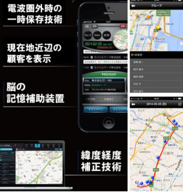 「フィールドで活躍する全てのモバイルワーカーへ~街を企業の情報ストレージに~」をコンセプトに、スマートデバイスから現在地近辺の顧客や営業情報がプッシュで表示される機能を通じて外出先で効率的な営業活動を実現する、特許出願中技術を実装した次世代のCRM/SFA(営業支援アプリケーション)です。