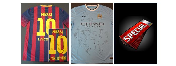 本キャンペーンでは、FCバルセロナのリオネル・メッシのサイン入りユニフォームやマンチェスター・シティFCの選手18名のサイン入りユニフォームなど、豪華賞品をご用意しております。さらに、事前登録された方全員に「FIFAワールドクラスサッカー2015」で利用可能なプレミアムチケットをお配りいたします。