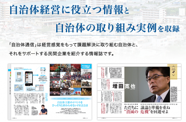 『自治体通信』は、経営感覚をもって課題解決に取り組む自治体とそれをサポートする民間企業を紹介する情報誌です。様々な自治体の具体的な取り組みをはじめ、自治体経営に役立つ情報をお届けします。