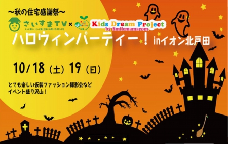 職業体験や本物に触れる体験など、子ども達の夢へのきっかけ作りを行う「Kids Dream Project(キッズドリームプロジェクト)/運営:スマイルママコム(代表:芳川ユミ)」は、埼玉県を中心とした住宅情報インターネット番組「さいすまTV(運営:エクシム株式会社(代表:西本和生))」との共催で、イオンモール北戸田にて、10月18日(土)と19日(日)の二日間にわたり、ハロウィンイベントを住宅フェアと同時に開催。各催しへの参加者を募集します。