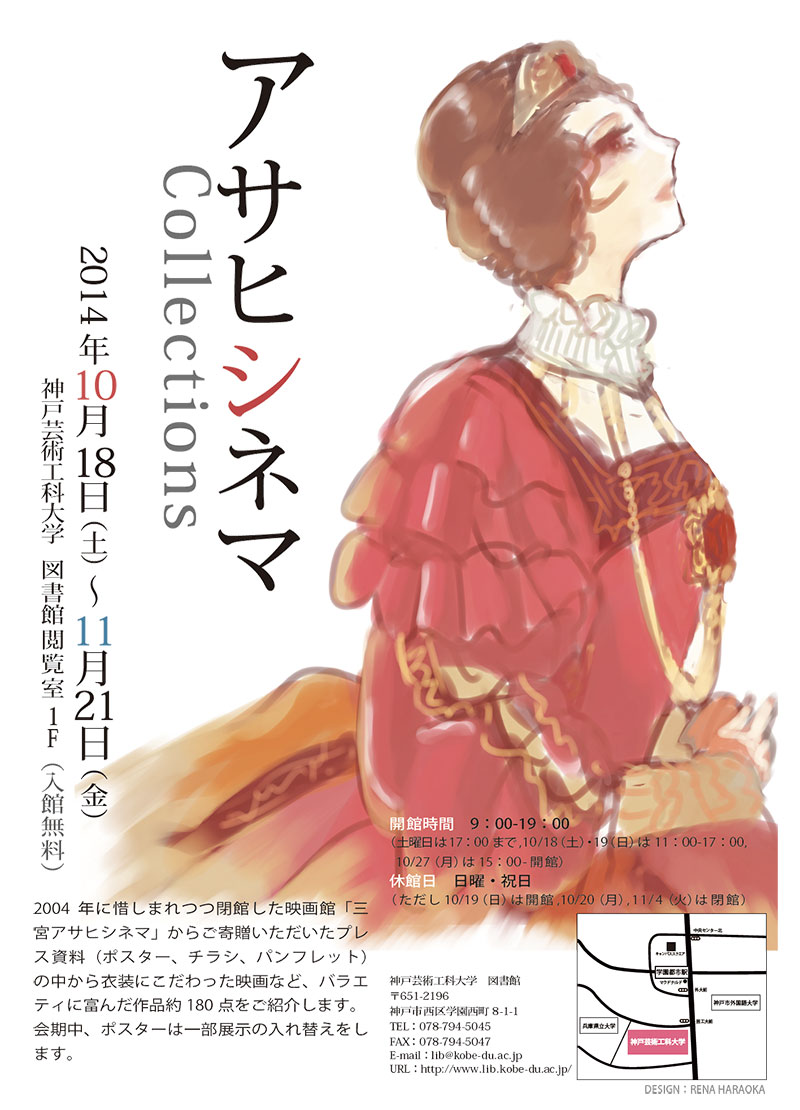 2004 年に惜しまれつつ閉館した映画館「三宮アサヒシネマ」より本学へ寄贈いただいた様々な映画作品プレス資料の中から、今回は衣装にこだわりある作品などをセレクト、それら作品のポスター・チラシ・パンフレットなど約180 点をご紹介いたします。