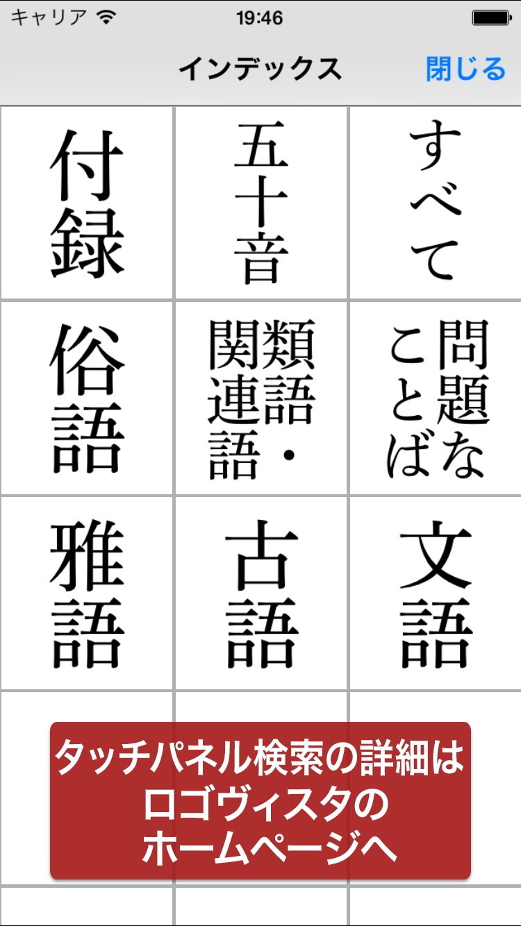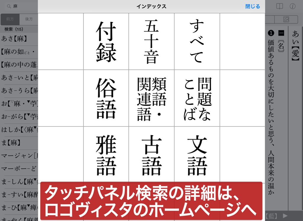 LogoVista電子辞典で培った検索方法を継承。前方一致/後方一致/完全一致/部分一致/全文検索といった豊富な検索オプションを利用できます。また文字を入力すると候補見出し語が表示され、うろ覚えでも検索できるインクリメンタルサーチや、検索結果に表示された本文中の用語をなぞることでそのまま連続辞書引きも可能。思考を妨げることなく次々と検索できるのが特長です。マルチタッチによる拡大やセンサーによる画面の回転にも対応しています。
