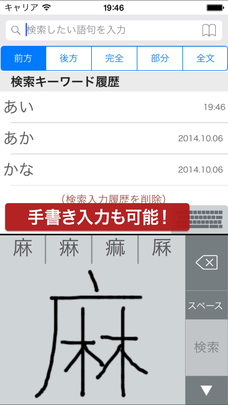 ●豊富な検索オプションを用意(前方一致検索・後方一致検索・完全一致検索・部分一致検索・全文検索)。それぞれの検索方法で、文字を入力すると候補見出し語が表示されるインクリメンタルサーチに対応。(部分一致、全文検索を除く)用語をうろ覚えでも検索が容易です。
