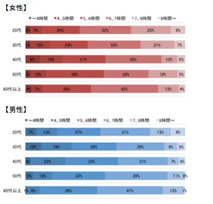 30代、40代は2割程度でした。そして、「5、6時間」「6、7時間」と回答されている方はどの年代も3~4割となりました。