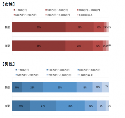 女性の場合、あまり朝型・夜型に極端な違いはありませんが、注目するべきは「500万円以上」の数値です。「500万円~700万円」「700万円~1,000万円」の朝型は1~2%ですが、夜型は3%となり、僅かですが夜型のほうが高い割合でした。