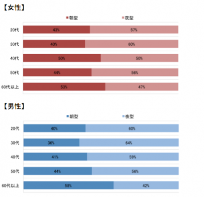 年齢別にみていきますが、20代~50代は男女ともに夜型が多く、夜型の割合は5~6割程度、朝型の割合は4~5割程度となりました。
