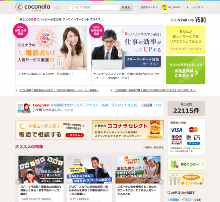 ココナラとは”知識・スキル”の個人間ワンコイン販売サイトです。誰もが得意を活かしたサービスをネット上で気軽に提供できるようにと、「簡単な出品の仕組み」「初期費用や月会費無料」「サービス提供の基本価格が一律500円のワンコイン」を実現した日本初のサイトです。2012年7月3日にサービス開始後、登録ユーザー数約11万人、出品サービス数約2万件、累積取引成立数は約15万件と、日本最大級の規模を誇ります。