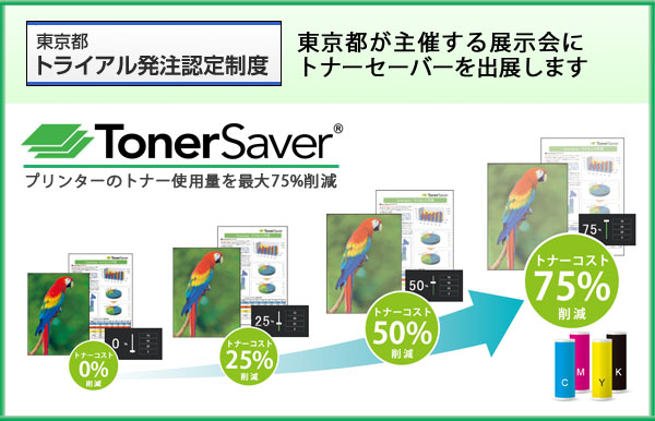 株式会社スプライン・ネットワーク(東京都渋谷区、代表取締役社長:雪野 洋一)は、都内中小企業の新規性の高い優れた新商品の普及を支援する「東京都トライアル発注認定商品」に選定されたTonerSaver(トナーセーバー)を、東京都が主催する展示会に出展することをお知らせします。展示会は、2014年10月15日(水)~16日(木)に東京都庁で開催され、カタログをはじめ、印刷サンプルや説明パネルによりTonerSaverの効果を確認できます。
