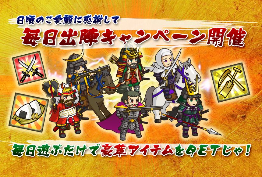 大殿のほか、真田幸村や黒田官兵衛などの「武将」、足軽・鉄砲・騎馬などの「兵」の3兵種を使い分けながら、合戦で勝利し手に入れた「銅銭」を使って武将や兵のステータスを上げ、全100ステージのクリアを目指しましょう。