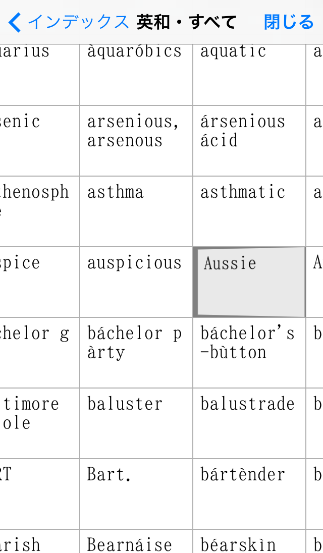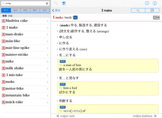●豊富な検索オプションを用意(前方一致検索・後方一致検索・完全一致検索・全文検索)。それぞれの検索方法で、文字を入力すると候補見出し語が表示されるインクリメンタルサーチに対応。(部分一致、全文検索を除く)用語をうろ覚えでも検索が容易です。