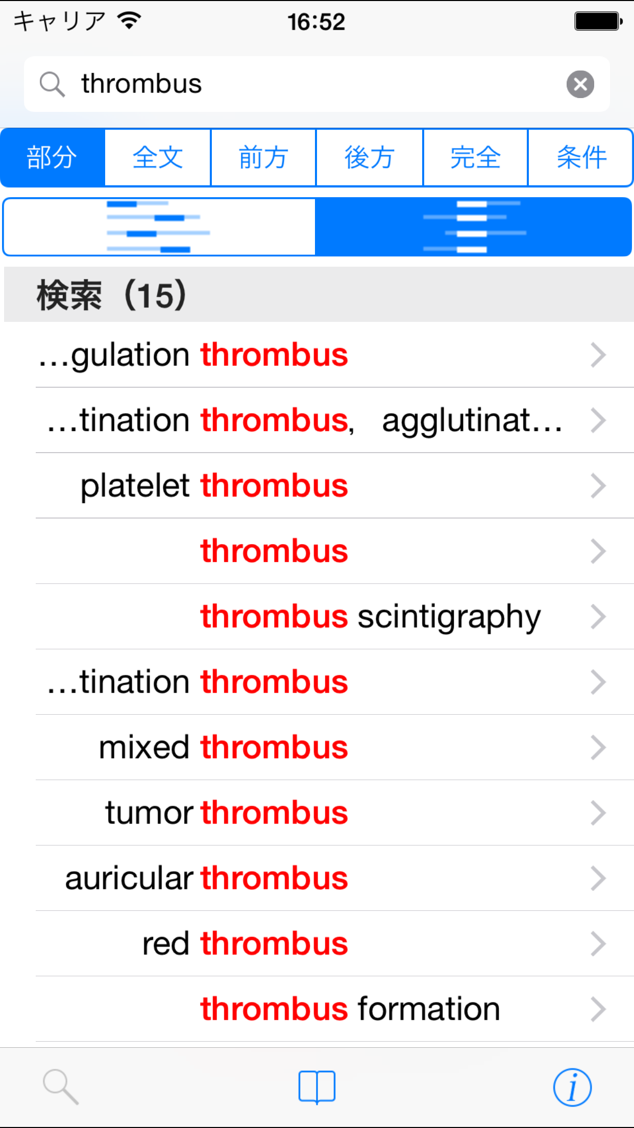 検索キーワードが見出し語(用語)のどの部分と一致したのか、分かりやすいように検索キーワードを中央に揃え、また色も変えて表示します。これによって難解な専門用語も直感的に探し出せます。