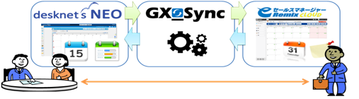 「GX_Sync」は、複数のカレンダー機能を有するシステムに登録されたスケジュールデータ、および、ToDoデータを、双方向に自動同期するためのソフトウェア製品です。グループウェアであるdesknet's NEOに登録されたスケジュールデータを営業支援システム(SFA)であるeセールスマネージャーRemix Cloudと双方向での自動同期を実現する唯一の製品となります。