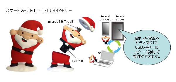 USB OTGは、USB IF(Implementers Forum、USBの規格制定団体)がUSB2.0の追加仕様として定めた規格です。 PCなどホストを介さずUSBデバイス同士(例えば:デジタルカメラやプリンタ、スマートフォンとメモリカードリーダ)をつなぐ規格として定められました。 OTG USBメモリーはPCとのデータ交換だけでなく、Androidスマートフォン/タブレット同士でのデータ交換も簡単に実現します。