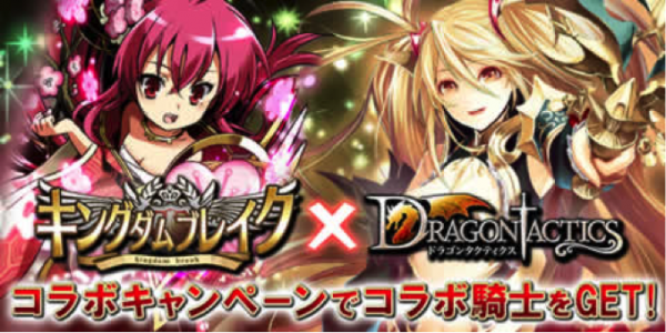 株式会社enish(本社:東京都港区、代表取締役社長:安徳 孝平、以下「エニッシュ」)は、大人気本格RPG『ドラゴンタクティクス』において、クローバーラボ株式会社(本社:大阪府大阪市、代表取締役:小山 力也)が提供する『キングダムブレイク』とのコラボを本日2014年10月16日(木)より実施します。豪華報酬の入手チャンスとなりますので、ぜひお楽しみください。当キャンペーン対象となるプラットホームはコロプラとなります。