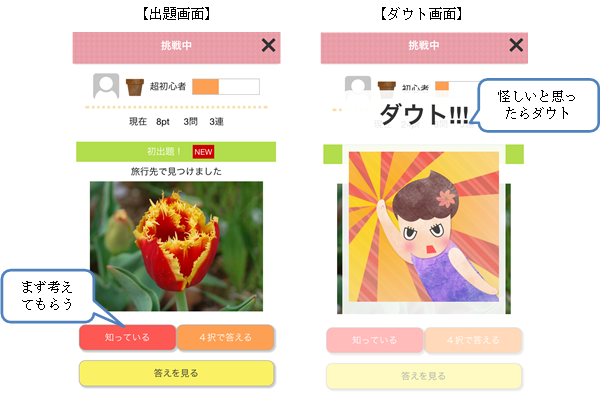 そこで、最初から4択を出さずに、まずは考えてもらい、知っている花だったら「知っている」、自信がなければ「4択で答える」を押して答えてもらうように工夫しています。