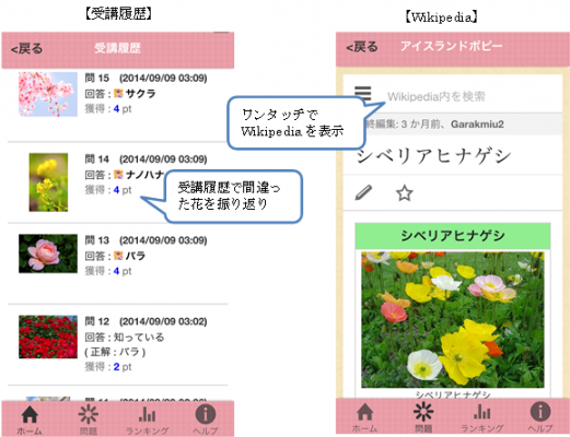 本アプリの目的は、あくまでも学習です。学習と言えば、復習が大切ですね。受講履歴を見ると、自分が解いた問題が一覧できますので、クイズ形式で楽しんだ後で振り返って覚えにくかった花の名前を再確認することもできます。