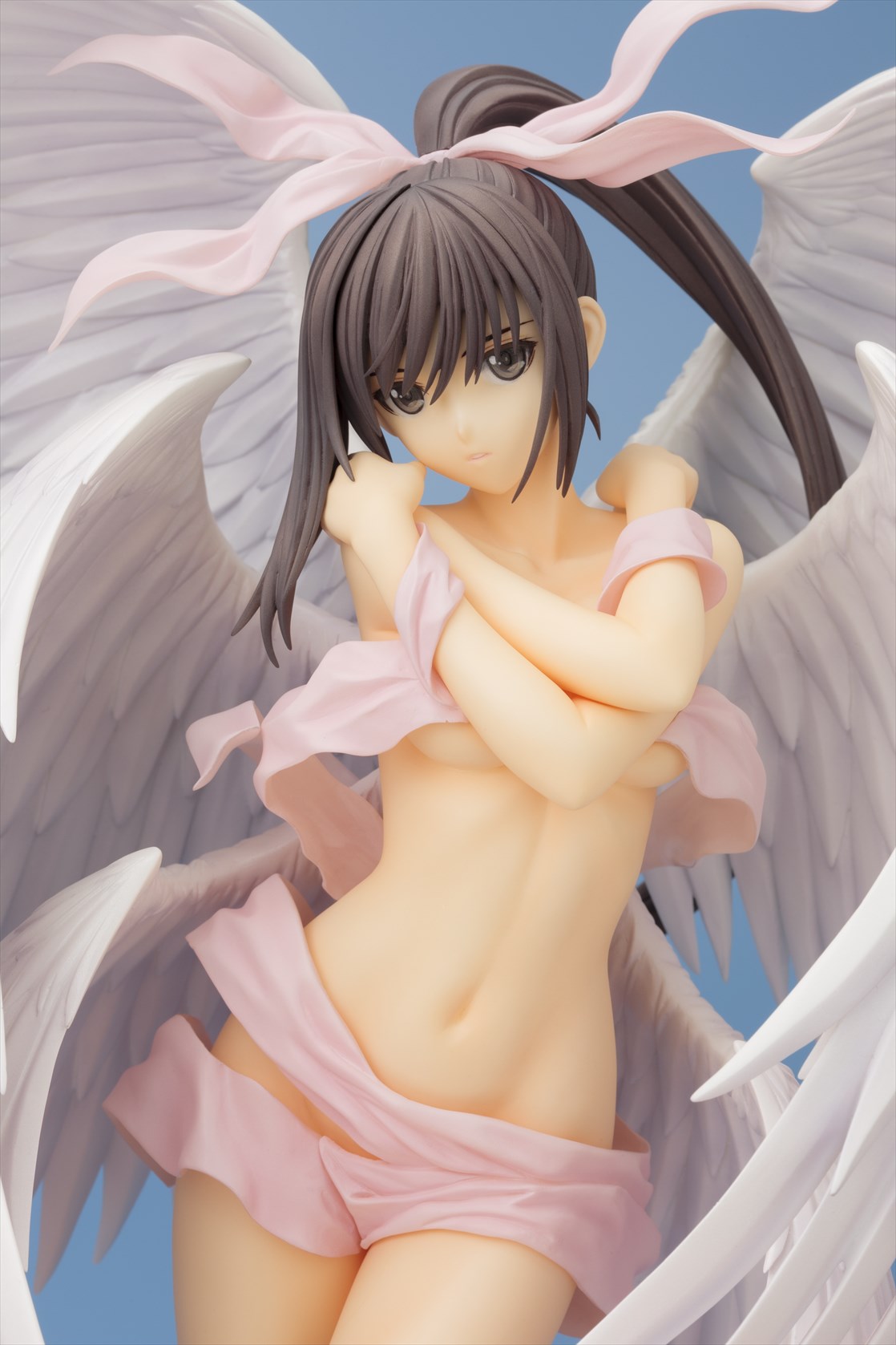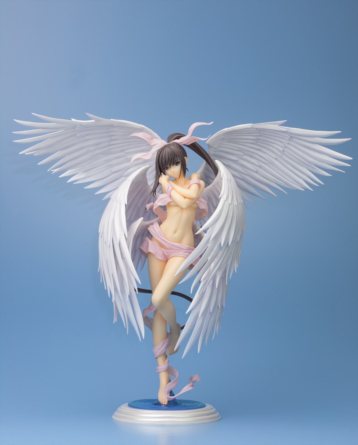 Tony氏の描く美麗なイラストを基に松本江永氏が渾身の立体化。全高約350mm、大きく広げた翼の全幅は約380mmにも及ぶ迫力サイズながら、布と翼からのぞく肢体もしなやかに美しく造形されています。全身を取り巻く薄布はクリア素材にフロスト塗装を施すことにより光を透過させ、軽やかな質感を表現、大きく羽ばたいた1対と身体を包み込む2対の巨大な6枚の翼は、パールコートにより柔らかな光沢を放つ羽根の質感を再現しました。フィギュア本体を引き立てるベースは水面をイメージしました。まさに女神降臨というべき神々しい姿、「サクヤ」の究極形ともいうべき造形をご堪能ください。