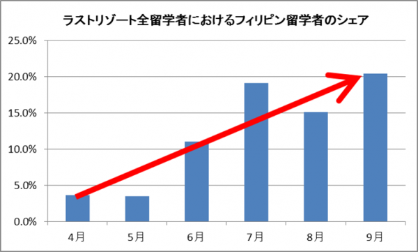 2014年4月から2014年9月の半年間で、当社におけるフィリピン留学渡航者が占める割合は毎月上昇していき、9月には海外全渡航者のうち2割に達したことから、フィリピン留学の販売において、確かな反響とさらなる可能性があることを示す状況となっています。