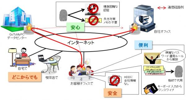 従来、「GoToMyPC」を利用する場合には、キーボードからユーザ名・パスワードによる認証を二回実施する必要があり、利用者自身で複雑なパスワードの厳格な運用管理を行っておりましたが、『GoToMyPC on Tri』では認証を指紋認証で実施するため、利用者はパスワードの入力の手間と運用管理から解放され、簡単に「GoToMyPC」を利用できるようになります。