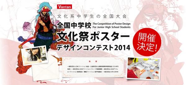 ファッション、ヘアメイク、ビューティ、グラフィックデザイン、映画、映像、フォト、ゲーム、マンガ、アニメ、パティシエ、カフェ、フードコーディネーターなどのクリエイティブ分野に特化し、即戦力人材を育成するスクール運営事業を行っているVantan(バンタン)(本部所在地:東京都渋谷区 代表:長澤俊二) は、高校卒業資格も取得可能なクリエイティブ専門高等教育スクール「バンタン高等学院」の主催により、全国の中学校を対象に、文化祭のポスターデザインのクリエイティビティを評価するコンテスト『全国中学校文化祭ポスター・デザインコンテスト2014』を開催致します。