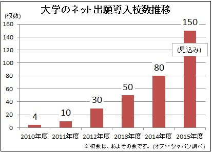 ネット出願は、24時間出願手続きができることや学校側の業務効率化などのメリットが支持され、近年、導入大学が急増しています。2015年度入試(2015年4月入学)では、およそ150大学が導入すると言われており(オプト・ジャパン調べ)、今後ますます導入が加速すると思われます。