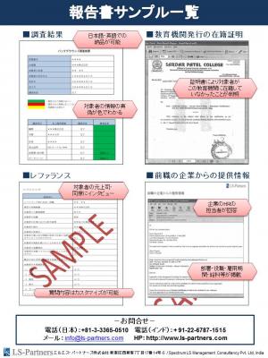 一方インドに子会社を構え独自ルート持つエルエス・パートナーズのバックグラウンド調査は、多岐にわたる調査項目を掲げた上で、さらにインド全土の調査員が実際に現地を訪問し、インタビューを実行。あらゆる角度から情報の真偽を分析する。また前職企業からの情報や、教育機関発行の在籍証明なども入手し、採用にあたり非常に現実的で実用性の高い報告書を提供している。本報告書は日本語・英語での納品、また調査項目のカスタマイズも可能。
