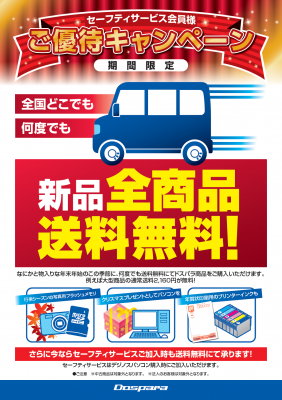 全国20店舗及びウェブ通販のパソコンショップを運営する株式会社ドスパラ(代表取締役社長:尾崎健介、本社:東京都千代田区)は、2014年10月23日(木)より、同社が提供する「セーフティサービス」会員様ご優待キャンペーンとしてドスパラ店舗およびドスパラ通販Webサイトにてご購入いただいた新品全商品の送料を何度でも無料とするサービスを開始いたしました。