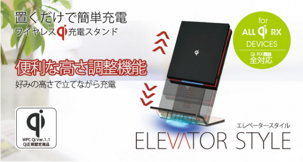 【ELEVATOR STYLEエレベータースタイル)】は、ワイヤレス充電国際規格である「Qi(チー)」に対応しており、レシーバー側がQi対応であれば、簡単に充電ができる。