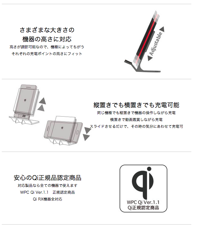 ・本体の高さを調整すれば縦置き横置き、スタンドを取り外せば平置きでも充電できます!
