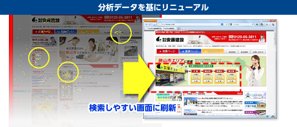 『株式会社安藤建設』様は埼玉県狭山市エリアを中心に賃貸・売買・リフォームを含め幅広く不動産業を展開する不動産会社です。今回リニューアルしたホームページは、かねてから課題となっていたユーザ動向について、【仲介名人】のオプション機能「クリック分析ツール」を導入し状況を解析しました。その結果、地域の検索に閲覧が集中していたため、検索しやすい構成に刷新。対象地域のニーズごとに対応したデザインにしたことで、ユーザビリティが向上しサイト離脱率が14%も減少しました。