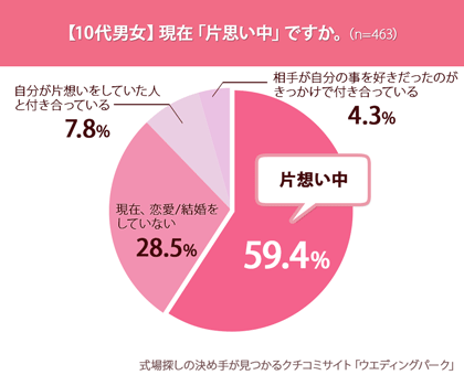10代の男女を対象にした調査結果では、「片想い中(59.4%)」、「現在、恋愛/結婚をしていない(28.5%」、「自分が片想いをしていた人と付き合っている(7.8%)」、「相手が自分の事を好きだったのがきっかけで付き合っている(4.3%)」となり、約6割は片想い中、約3割が恋愛お休み中であることがわかりました。
