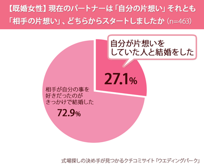 既婚女性を対象に「現在のパートナーは自分もしくは相手、どちらの片想いからスタートだったかを聞いたところ、「自分が片想いをしていた人と結婚をした(27.1%)」「相手が自分の事を好きだったのがきっかけで結婚した(72.9%)」と、既婚女性の3人に1人が自分が片想いだった人と結婚していることがわかりました。また、片想いから両想いになったエピソードでは「片想いの相手と付き合い始めて10年。来年結婚します!」や「ネットで始まった片想い。今では子どもにも恵まれ幸せ。」など、片想いからスタートし、幸せな結婚生活を送っている投稿が集まりました。