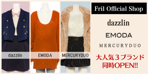 フリマアプリ『Fril(フリル)』を運営する株式会社Fablic(本社:東京都渋谷区 代表:堀井翔太)は、同サービス内でブランドの出品(BtoC)が可能な「Fril公式ショップ」にて、MARK STYLER株式会社(本社:東京都渋谷区 代表取締役社長:秋山正則)の運営する「MERCURYDUO(マーキュリーデュオ)」、「dazzlin(ダズリン)」、「EMODA(エモダ)」の常設店を、10月30日19:00よりオープンいたします。