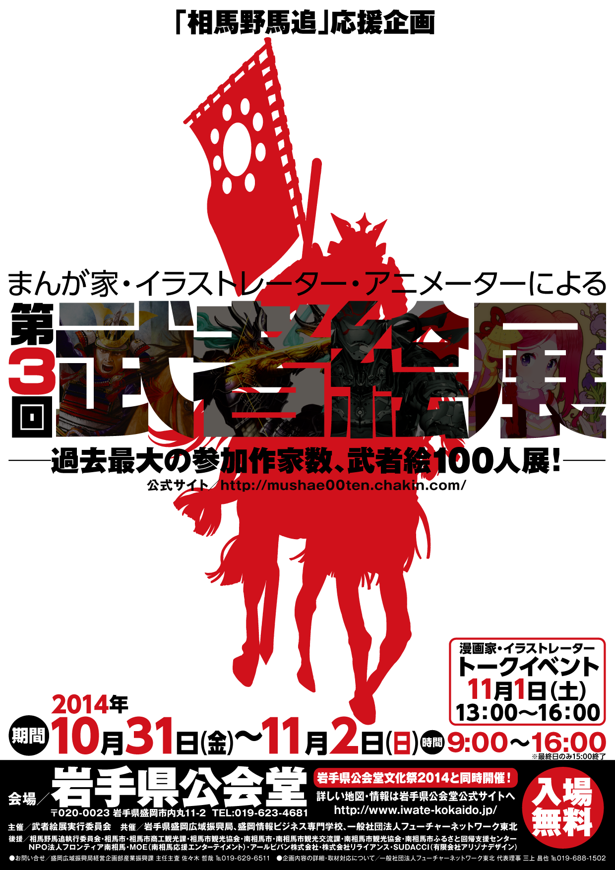 「相馬野馬追」応援企画としてはじまった「第3回 武者絵展」岩手巡回展が、過去最大の参加人数、武者絵100人展として、福島、福岡、東京に続き、盛岡で開催されます。