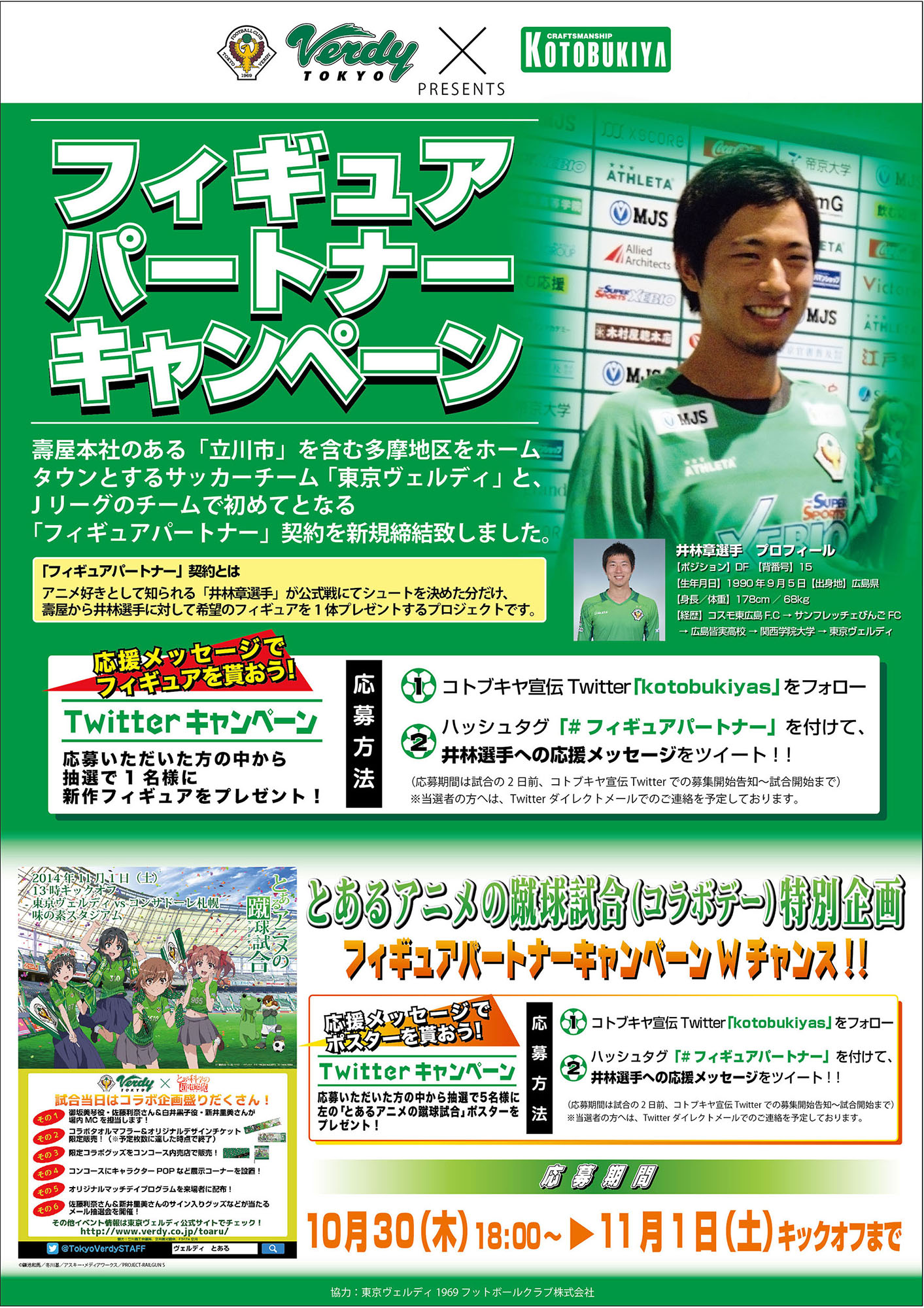 また、このイベント開催を記念して、東京ヴェルディ所属「井林章選手」がゴールを決めるたびにフィギュアをプレゼントする企画「フィギュアパートナー」でも、「Wチャンスプレゼントキャンペーン」を行います。「11月1日東京ヴェルディ vs コンサドーレ札幌 戦」フィギュアパートナーキャンペーンにご応募頂いた方の中から「とある」シリーズのキャラクターが載っているイベントの告知ポスターを抽選で5名にプレゼントします!フィギュアパートナーご応募方法は、コトブキヤ宣伝Twitter「@kotobukiyas」をフォローし、ハッシュタグ「#フィギュアパートナー」を付けて、井林選手を応援するメッセージをつぶやいて下さい。