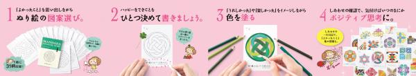 一行日記とマンダラぬり絵を組み合わせたフェリシモオリジナルの12カ月プログラムです。その日あった「よかったこと」を一行日記で記録し、その気持ちを思い出しながら図案をひとつ選んで、好きな色でぬり絵をします。一日の最後に「よかったこと」を思い出すことで毎日を気持ちよく締めくくり、いやなことがあっても次の日に引きずらない習慣ができます。継続することで、日々のしあわせなできごとの記録が集まり、いつの間にかポジティブ思考が育つ仕組みになっています。