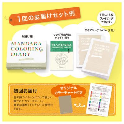 【セット内容】 マンダラぬり絵パッド(B7判32枚)1冊、ダイアリーアルバム2冊、オリジナルカラーチャート1枚(初回のみお届け)。