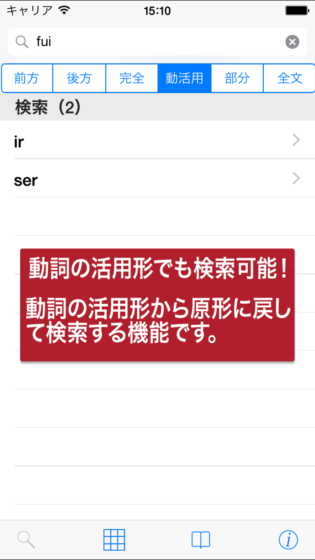●前方一致検索で辞典の見出し語にヒットしなかった場合に、語尾の活用形を変化させて再度検索する仕組みを組みを登載しました。
